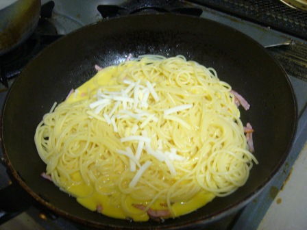 牛乳大さじに2、卵2個、一つかみのチーズと麺を入れてよく混ぜます。