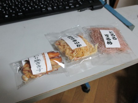 お店の左手に、100円珍味ゾーンがあって、そこで何種類か売ってて、その一部の子たちです。